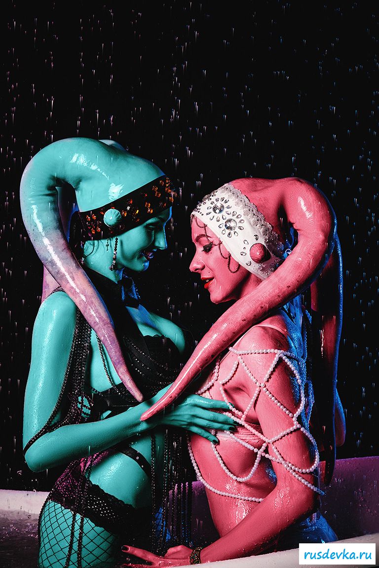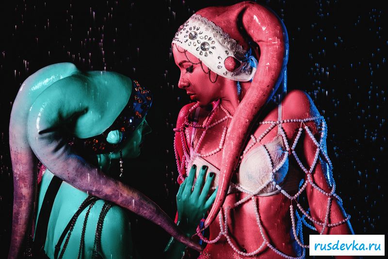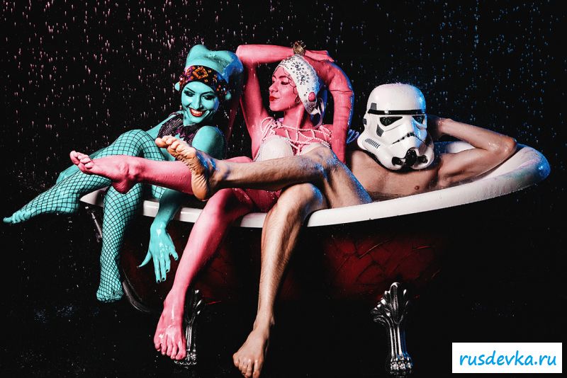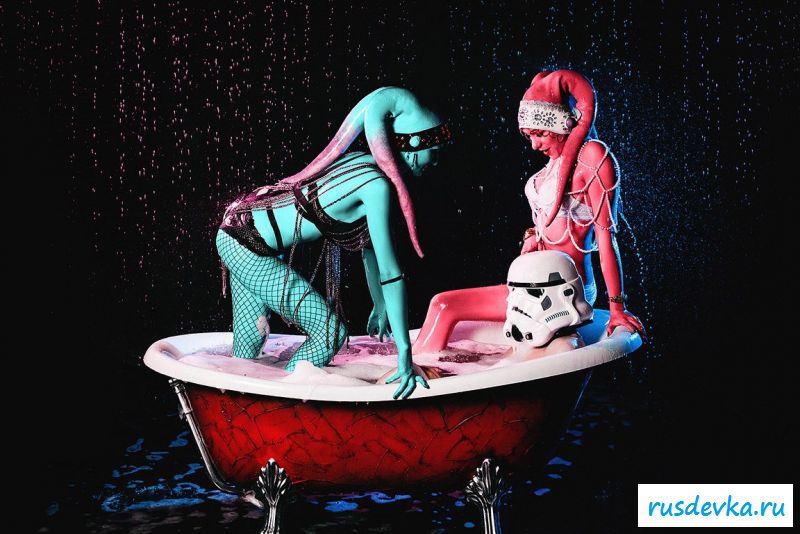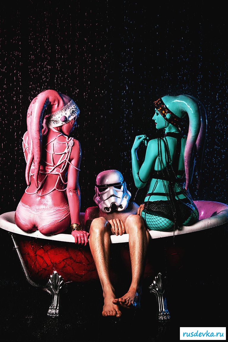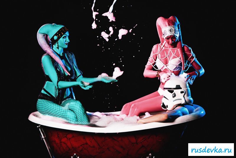 Наверняка любители профессионального косплея заинтересует тематика представленная в этой фотосессии, а именно перед нами Звездные войны с одним штурмовиков и двумя Тви’лек в ванной, да думаю здесь мужик лишний, но он дополняет общий образ телочек. Симпатичная эротика выглядит отлично особенно учитывая любимый многим фильм. Бирюзовый и розовый цвет в который покрашены тела девчат под разными световыми эффектами сморится очень сексуально и незабываемо, как раз именно после таких кадром можно долго вспоминать о них.