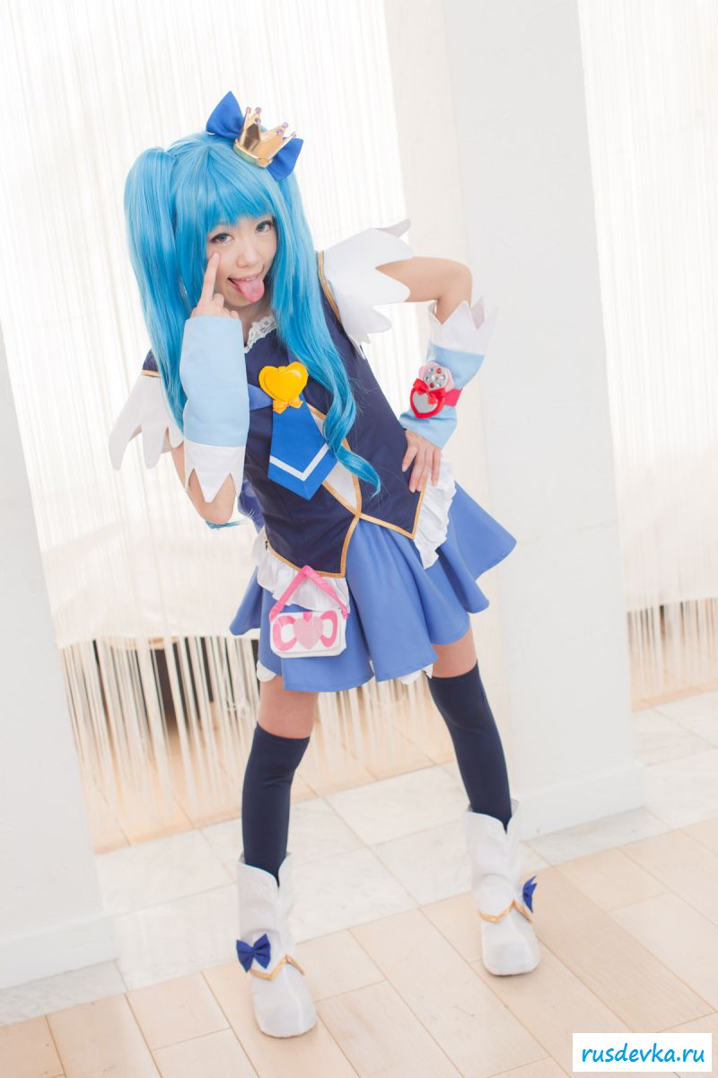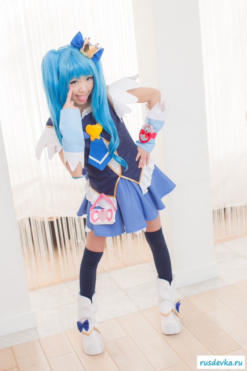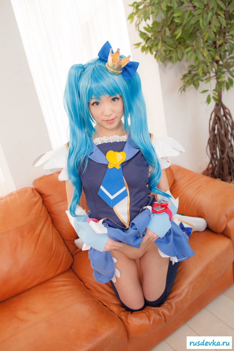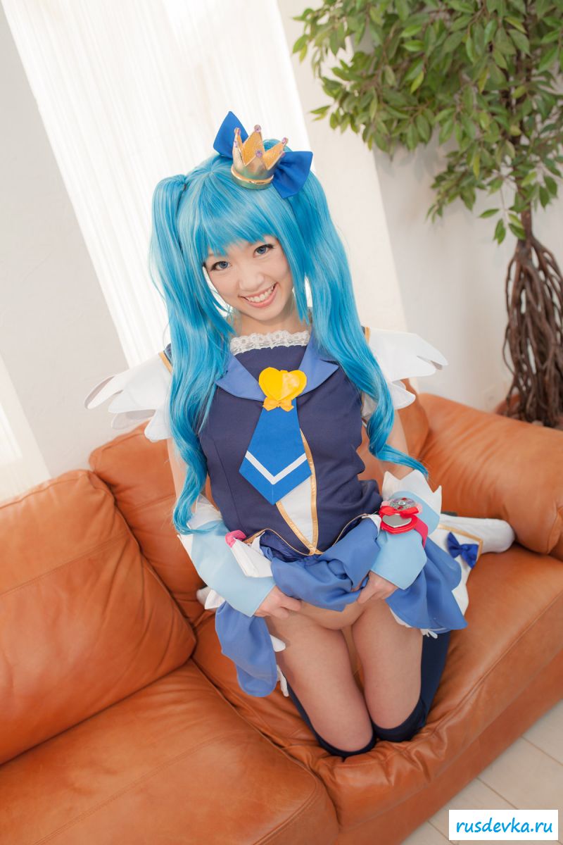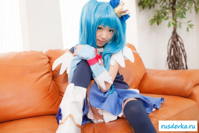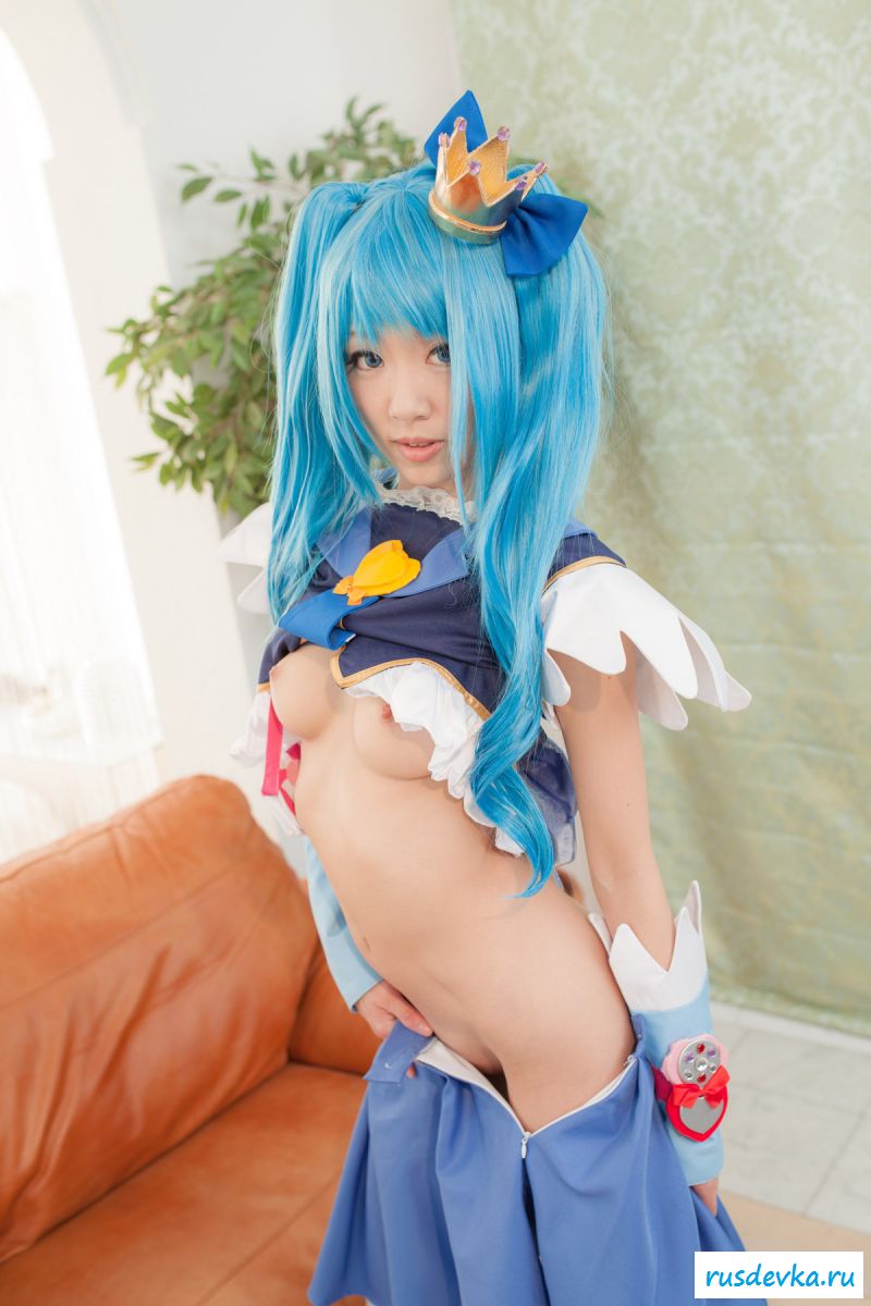 Продолжим интересную тематику косплей фото. Перед нами очередной персонаж из аниме мультика, ну уж очень она похожа на нашу Мальвину. Впрочем, что толку, может кто узнает, тогда сразу вспомним кого она пародирует. Синие волосы и прикольный костюм, это только начало и совсем скоро мы увидим полностью обнажённую девку, только рубашку не снимет, но сиськи и побритую пилотку точно сможем рассмотреть. Остаётся один открытый вопрос, зачем была заклеена лейкопластырем пизда, может быть это цензура.