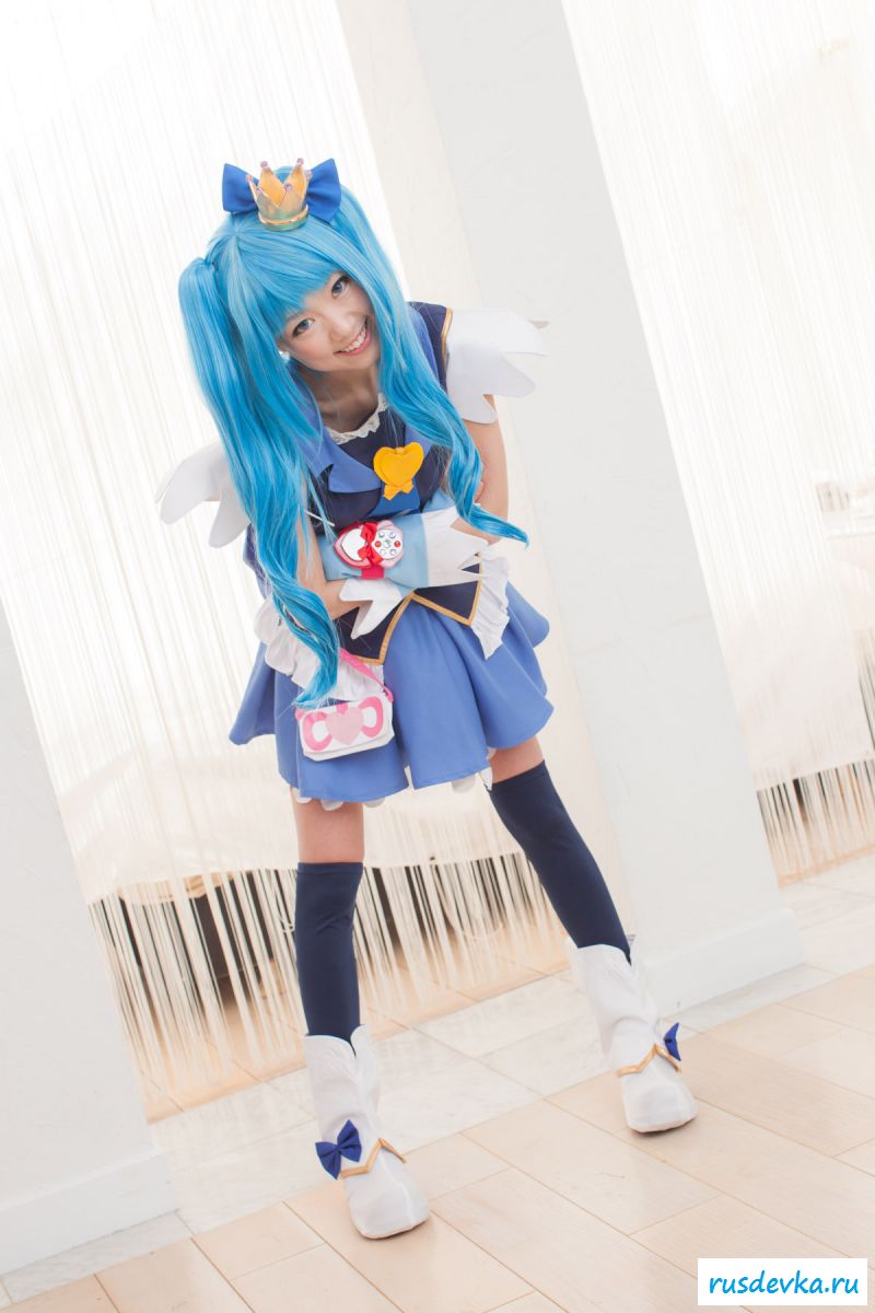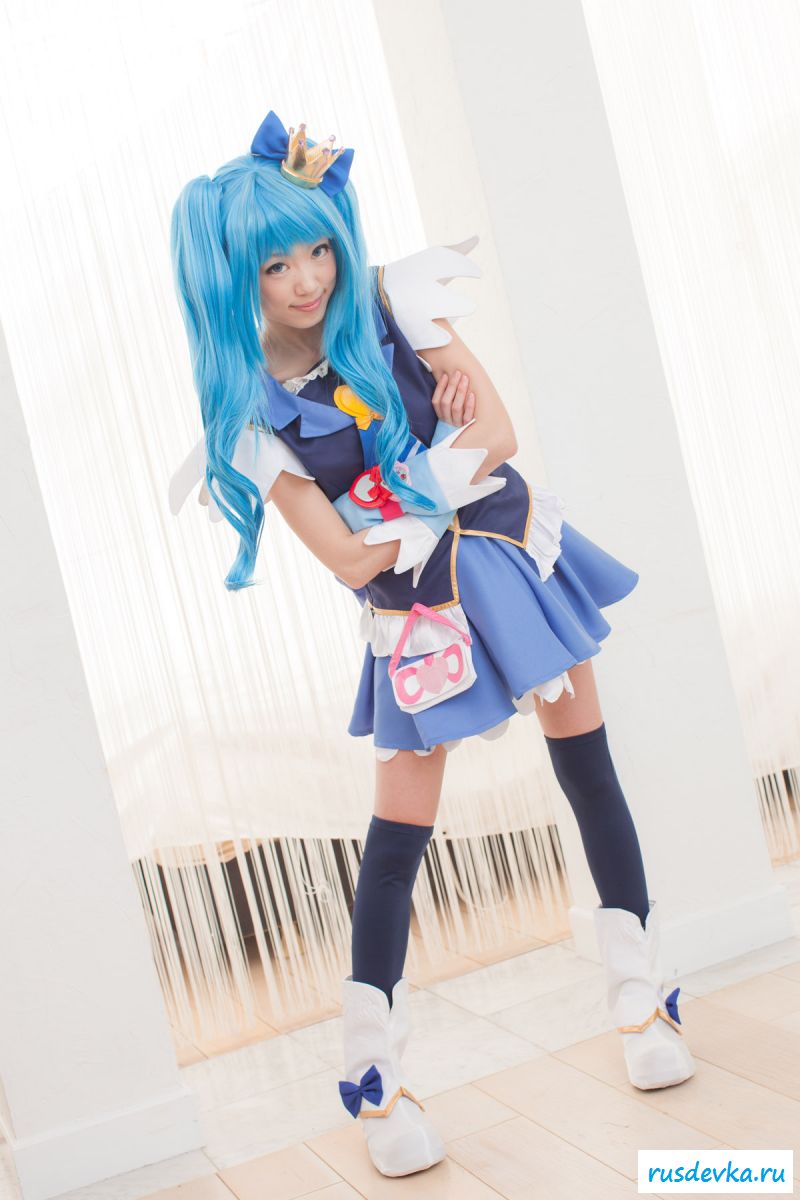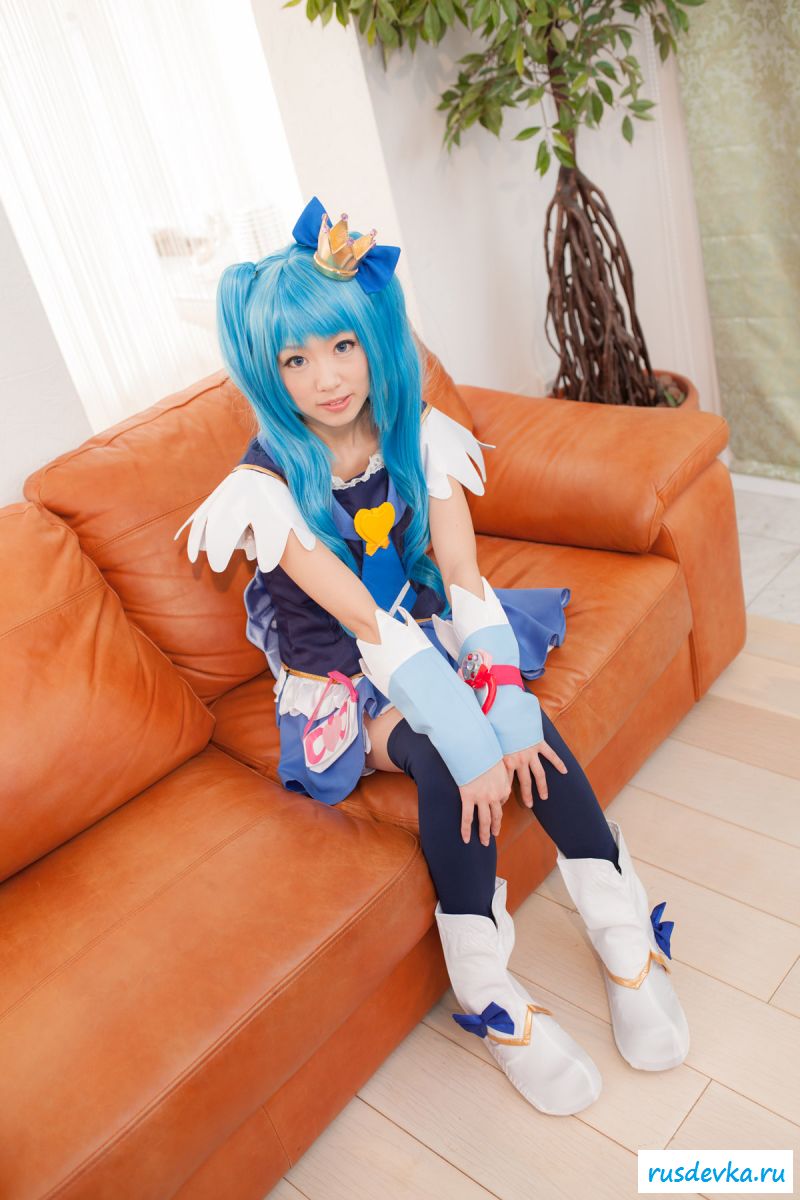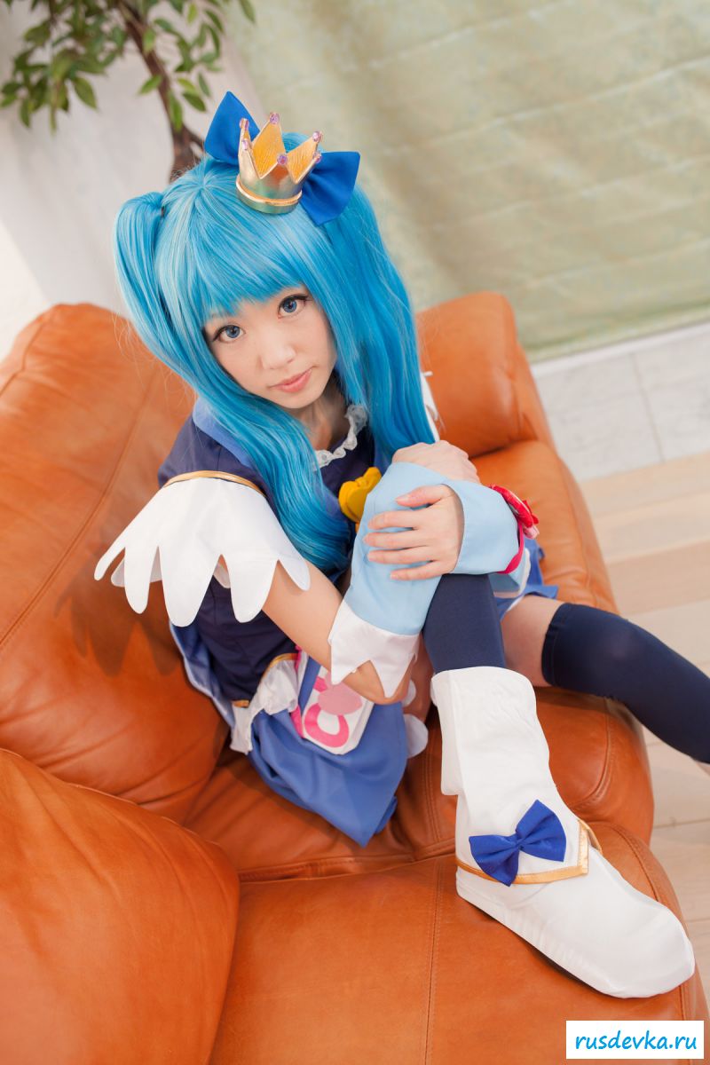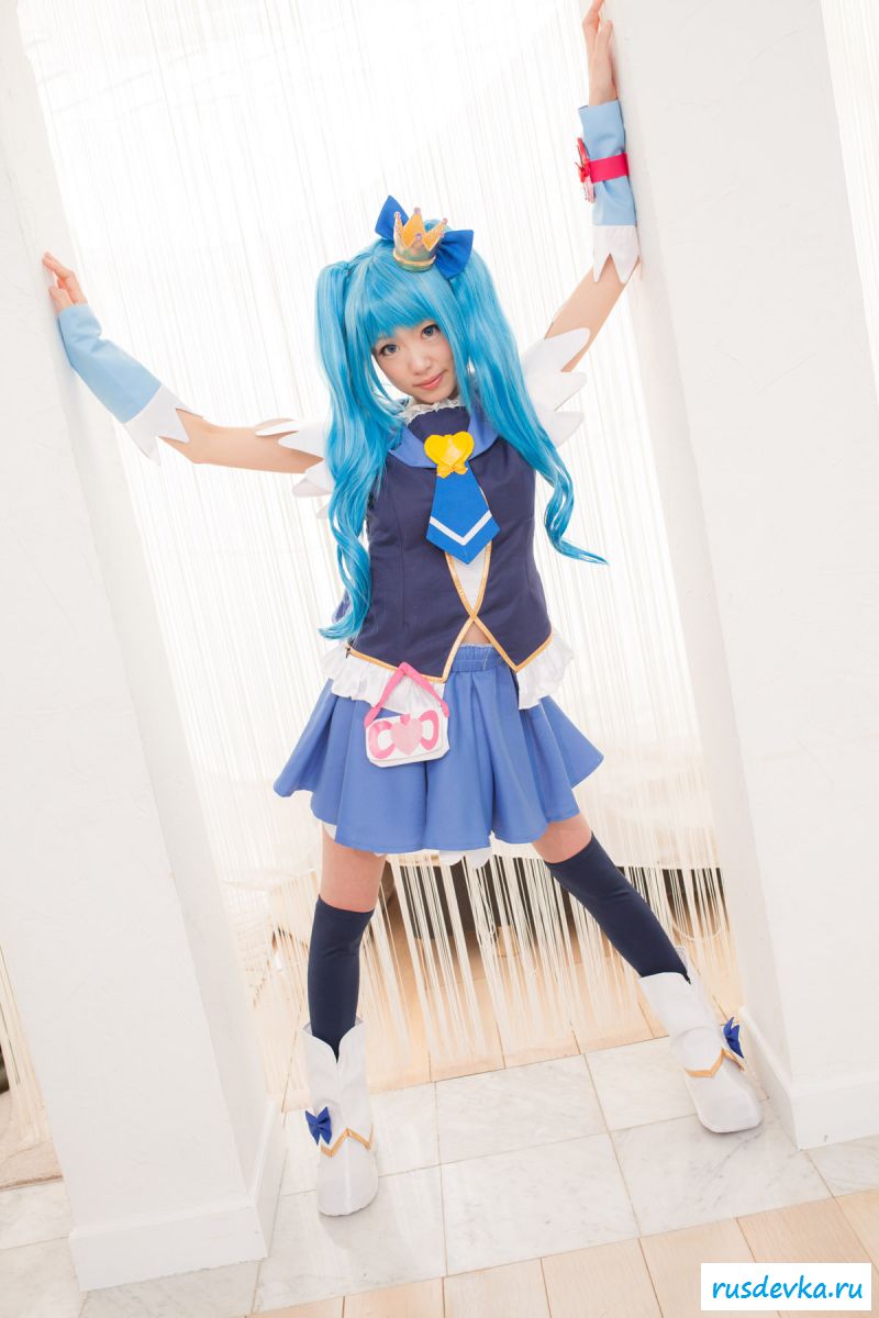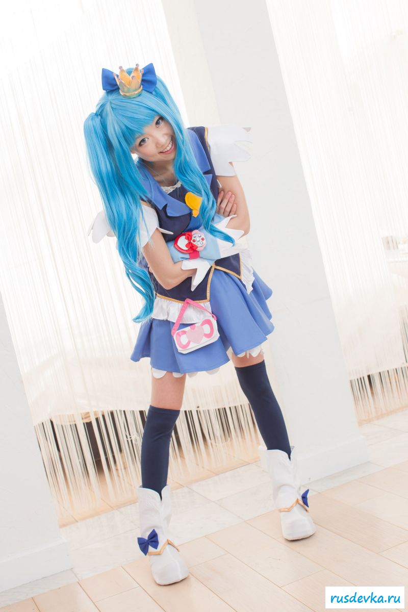Продолжим интересную тематику косплей фото. Перед нами очередной персонаж из аниме мультика, ну уж очень она похожа на нашу Мальвину. Впрочем, что толку, может кто узнает, тогда сразу вспомним кого она пародирует. Синие волосы и прикольный костюм, это только начало и совсем скоро мы увидим полностью обнажённую девку, только рубашку не снимет, но сиськи и побритую пилотку точно сможем рассмотреть. Остаётся один открытый вопрос, зачем была заклеена лейкопластырем пизда, может быть это цензура.