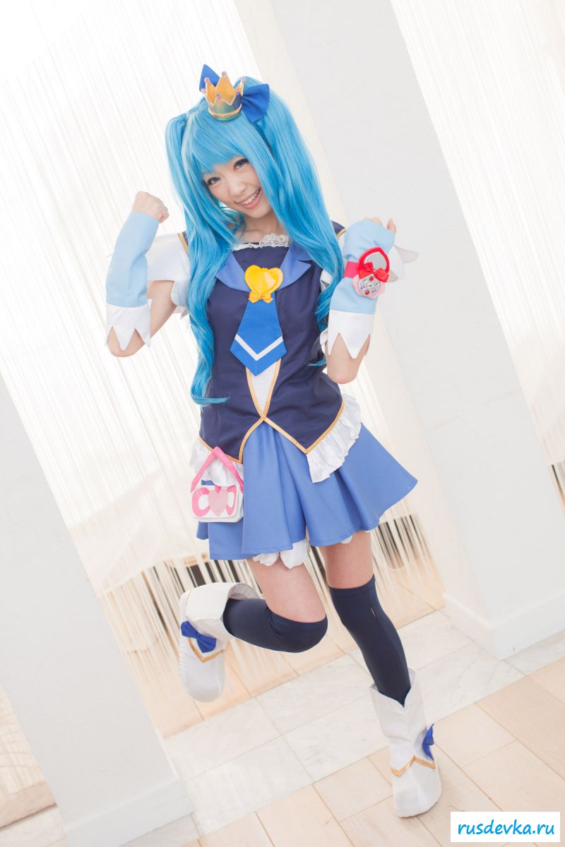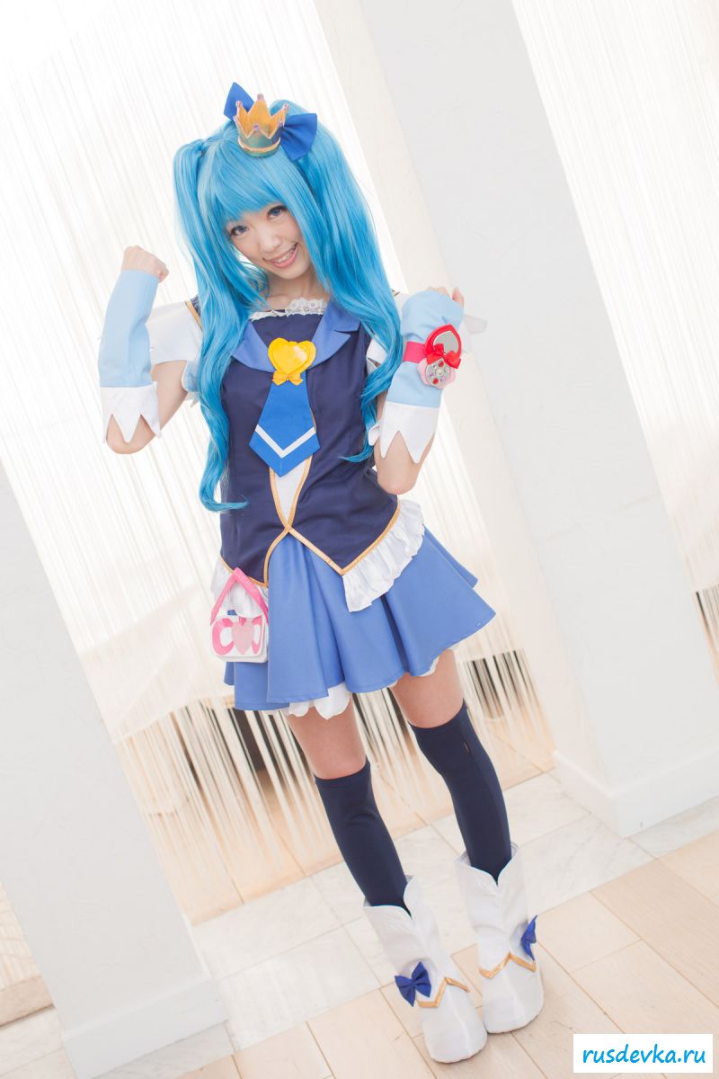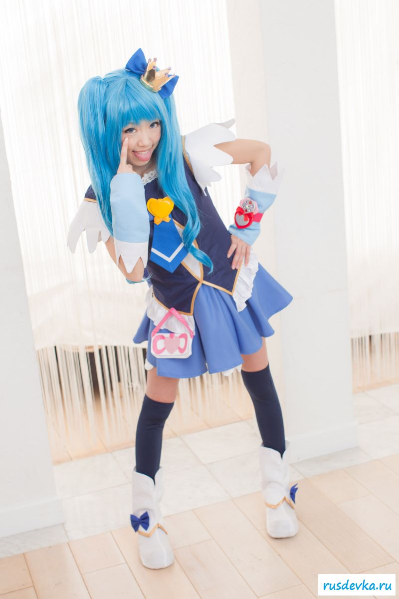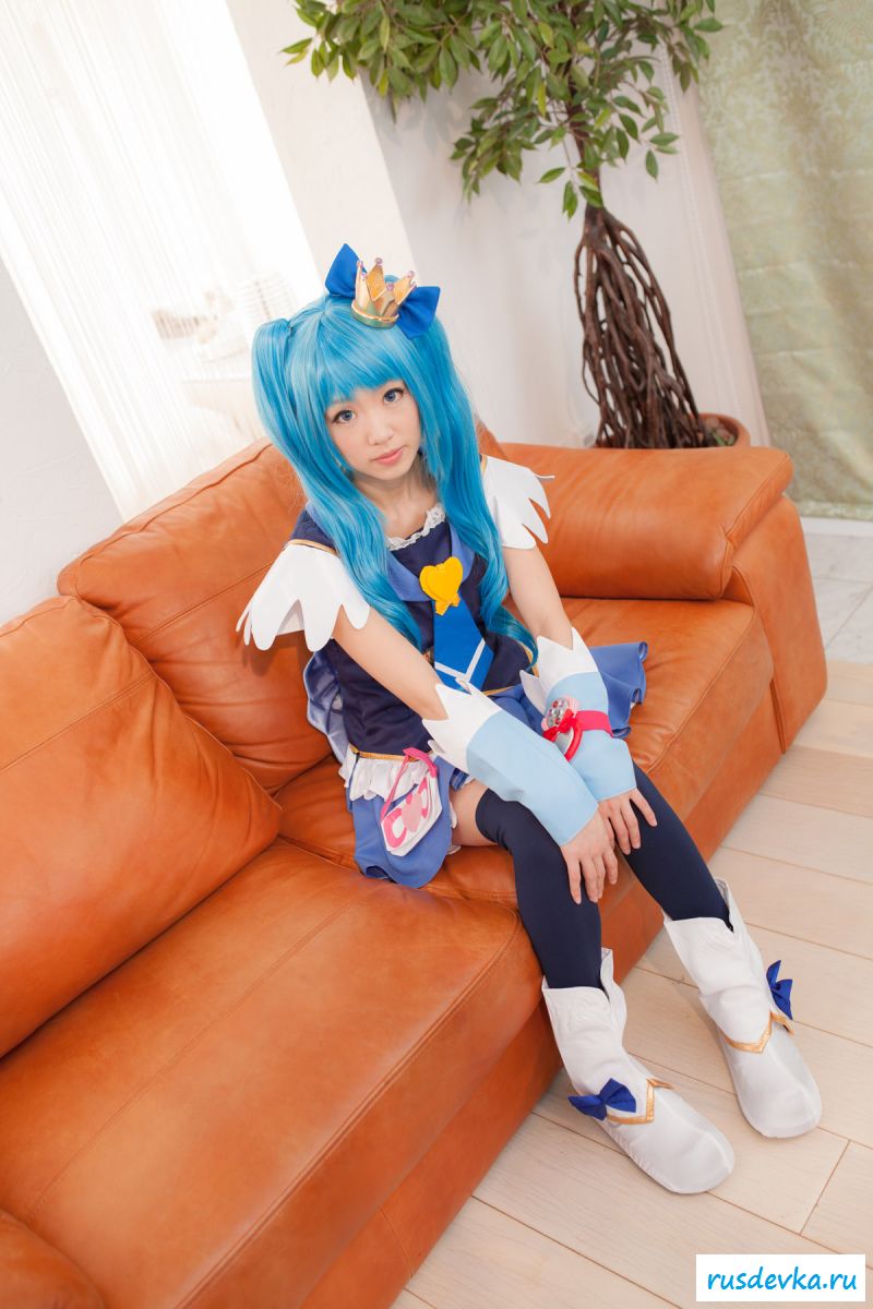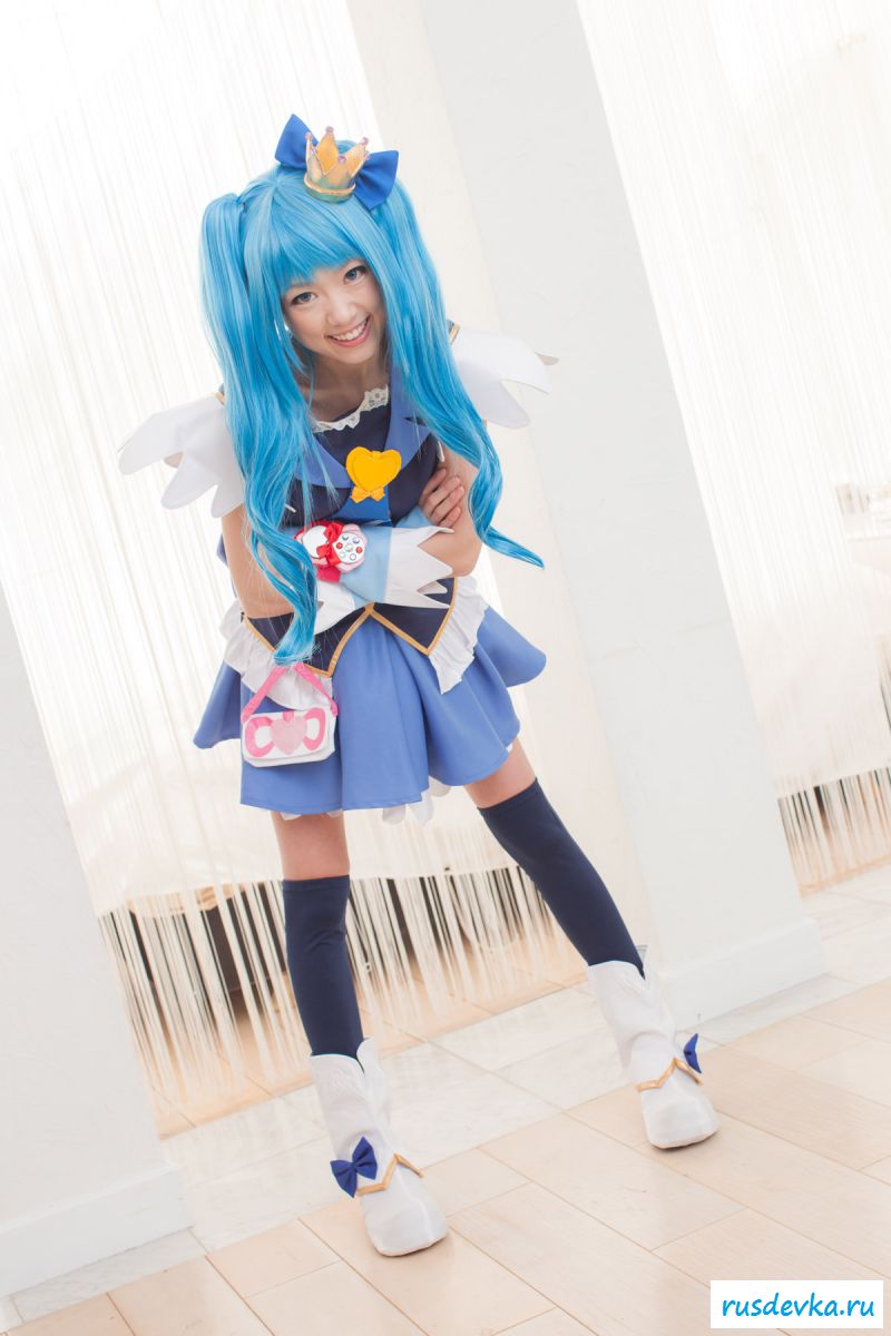 Продолжим интересную тематику косплей фото. Перед нами очередной персонаж из аниме мультика, ну уж очень она похожа на нашу Мальвину. Впрочем, что толку, может кто узнает, тогда сразу вспомним кого она пародирует. Синие волосы и прикольный костюм, это только начало и совсем скоро мы увидим полностью обнажённую девку, только рубашку не снимет, но сиськи и побритую пилотку точно сможем рассмотреть. Остаётся один открытый вопрос, зачем была заклеена лейкопластырем пизда, может быть это цензура.
