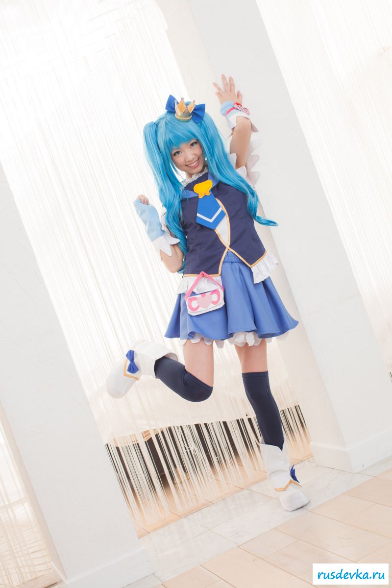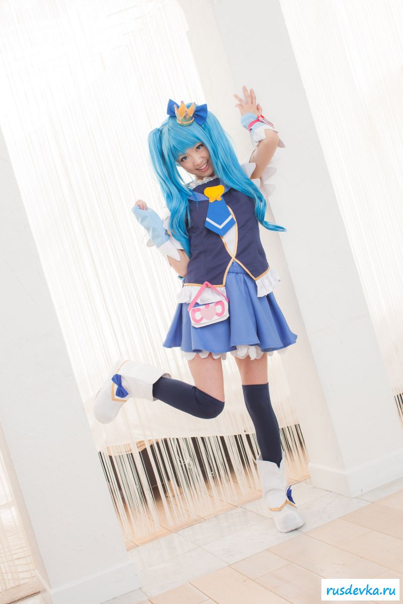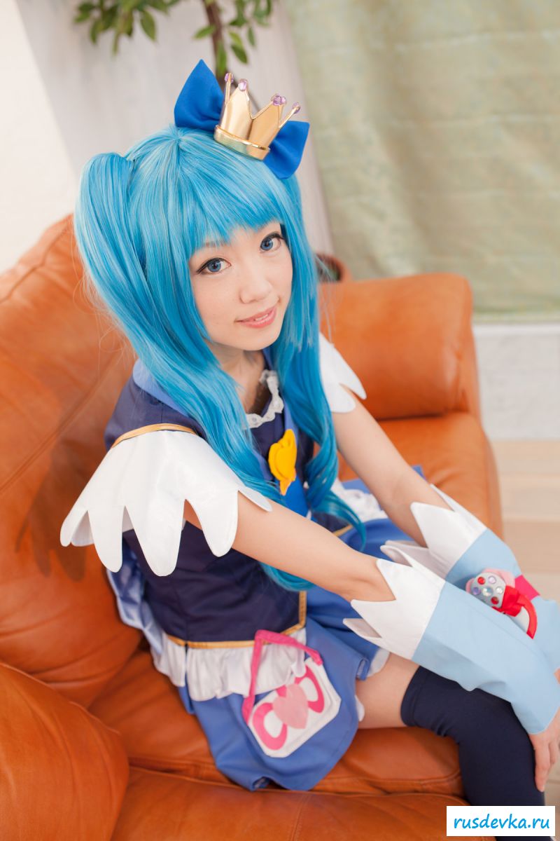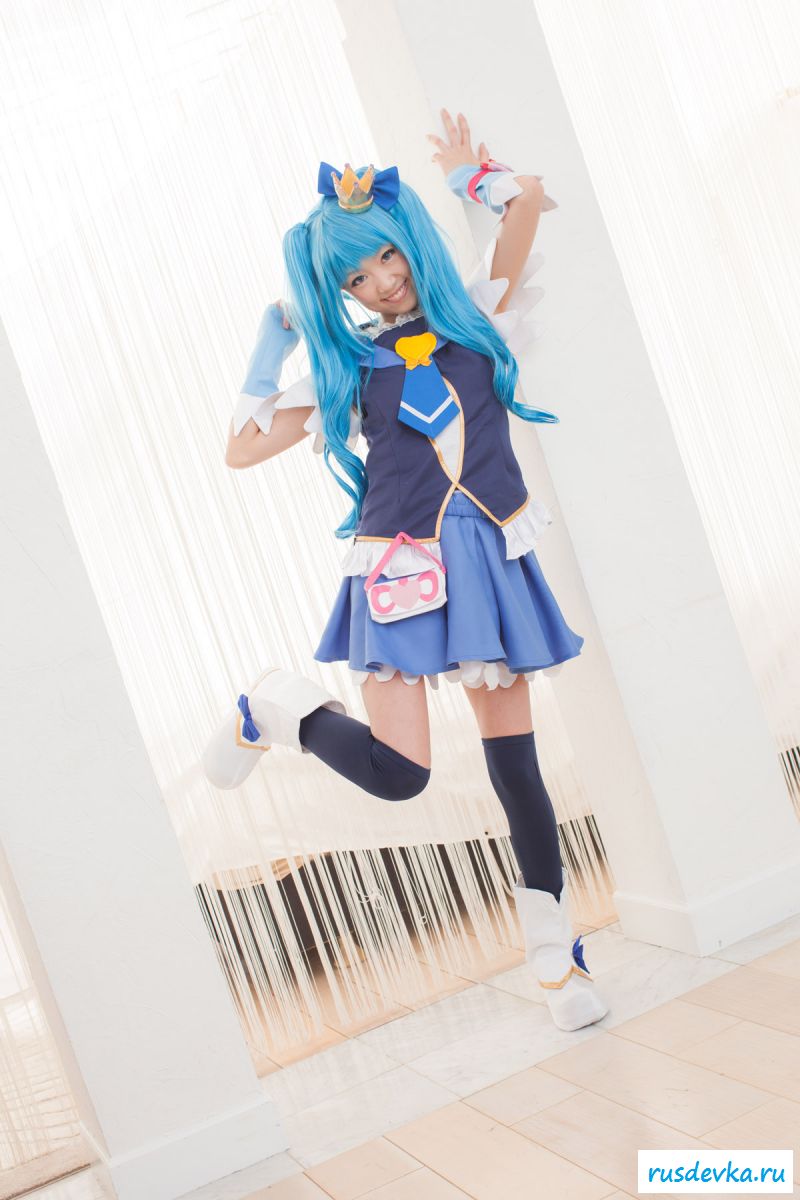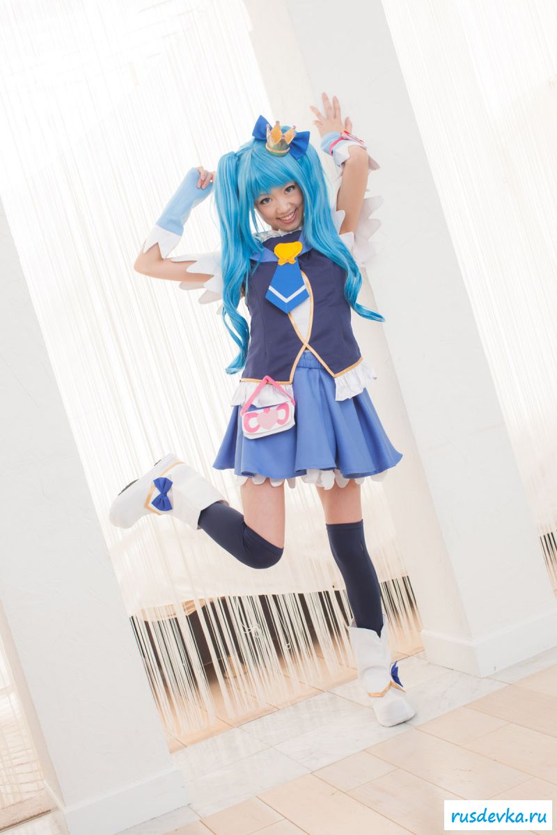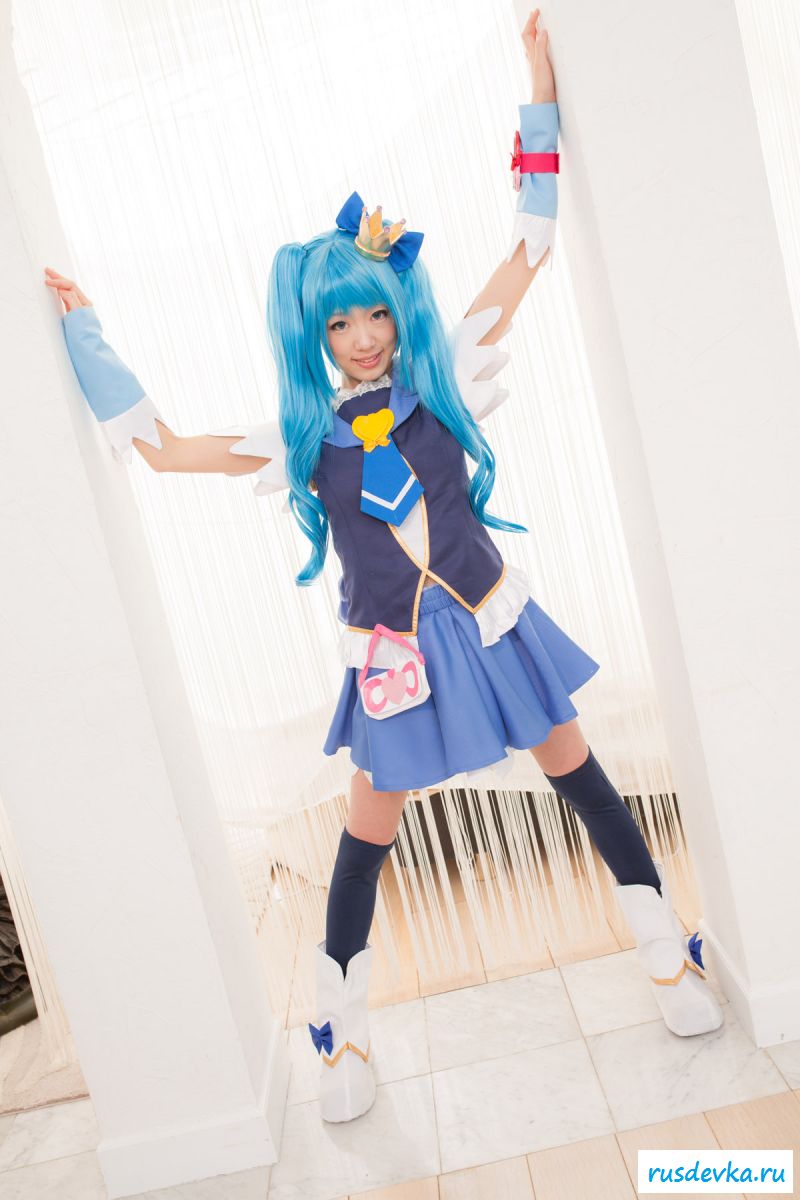Продолжим интересную тематику косплей фото. Перед нами очередной персонаж из аниме мультика, ну уж очень она похожа на нашу Мальвину. Впрочем, что толку, может кто узнает, тогда сразу вспомним кого она пародирует. Синие волосы и прикольный костюм, это только начало и совсем скоро мы увидим полностью обнажённую девку, только рубашку не снимет, но сиськи и побритую пилотку точно сможем рассмотреть. Остаётся один открытый вопрос, зачем была заклеена лейкопластырем пизда, может быть это цензура.