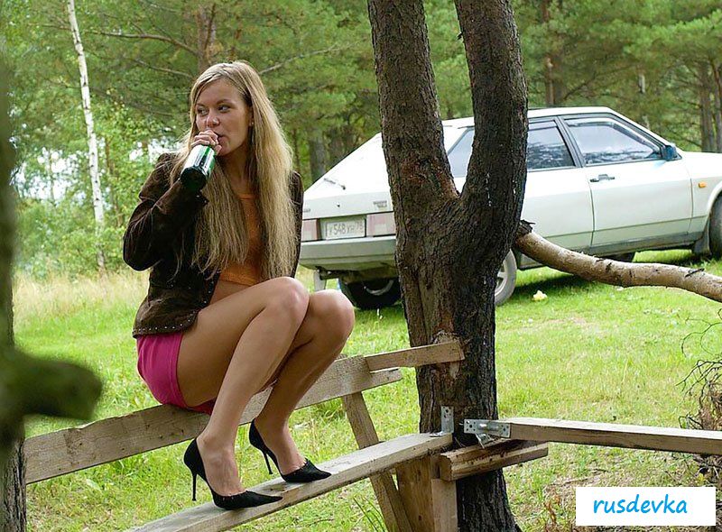 Ребята вывезли блондинку в лес на девятке только, для того чтобы сделать несколько откровенных фотографий и выпить пива. Приехав на лужайку и сев на скамейку, она принялась употреблять хмельной напиток. И как только девица опустошила бутылку, красотка отставила ее в сторону и сняла с себя трусики. Забравшись обратно на лавочку, она раскинула ноги обнажая выбритую пилотку с колечком в клиторе и, раздвинул губки она начала писать, исправляя естественную нужду. После чего протерла всё насухо, одернула юбку и собралась уходить.