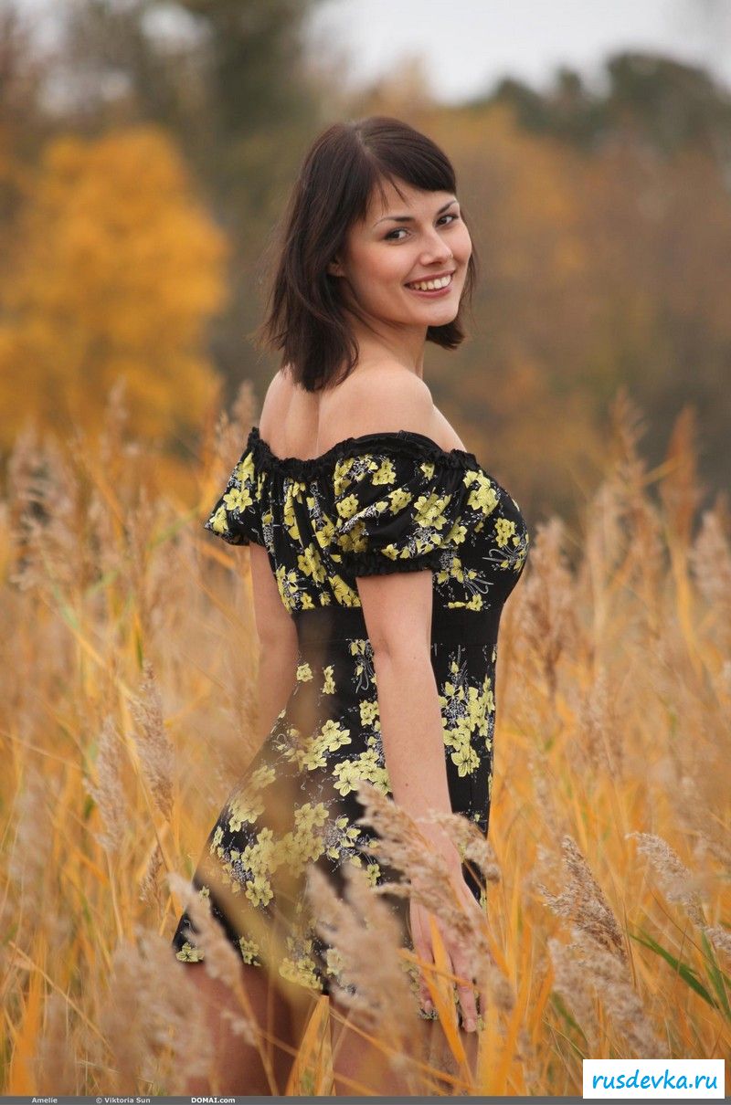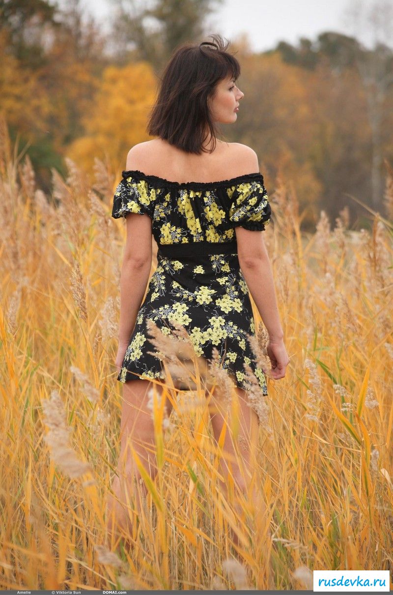 В одном цветастом платье одетое на голое тело, брюнетка отправилась на прогулку. Добравшись до заброшенного поля с удовольствием избавилась от ненавистного куска материи, который скрывает стройное тело. Русская девица как оказалось, позирует недалеко от железнодорожных рельс, по которым курсируют товарняки, вот будет праздник у машиниста увидеть такую красоту в гордом одиночестве. Меняя позы тиская свою грудь и пилотку, деваха сексуально будет позировать показывай все свои закоулки тела.