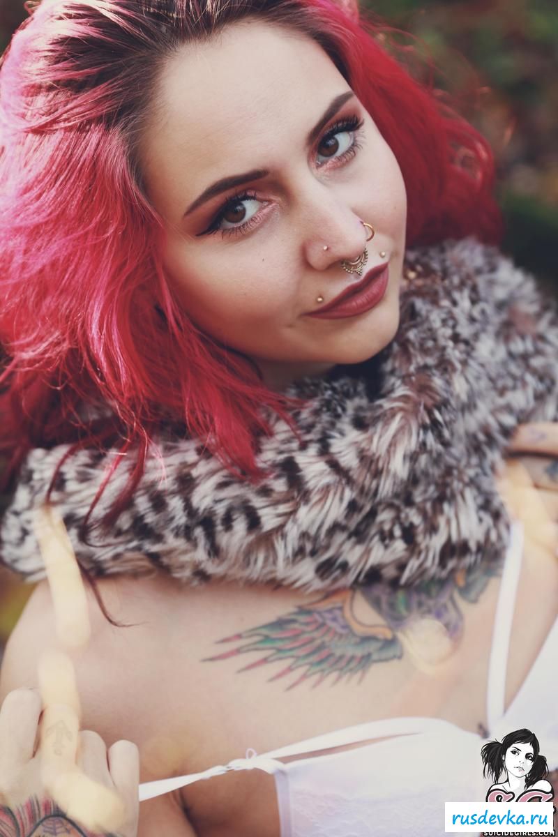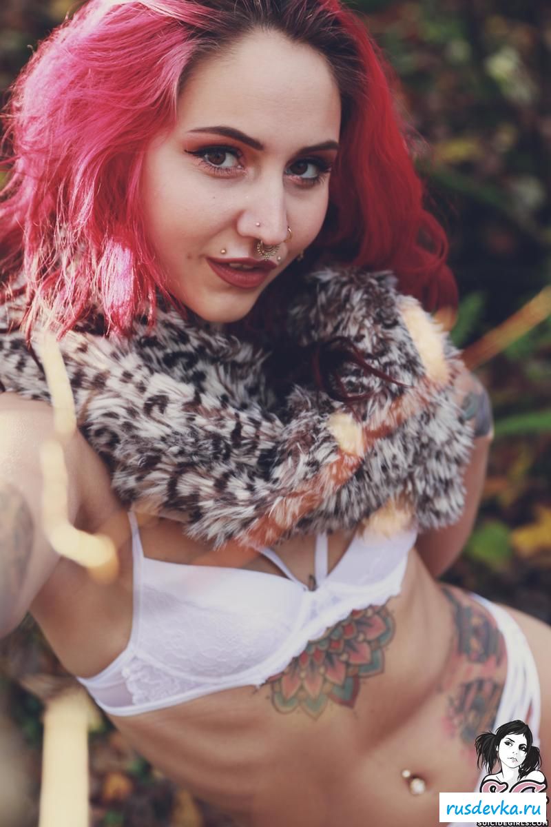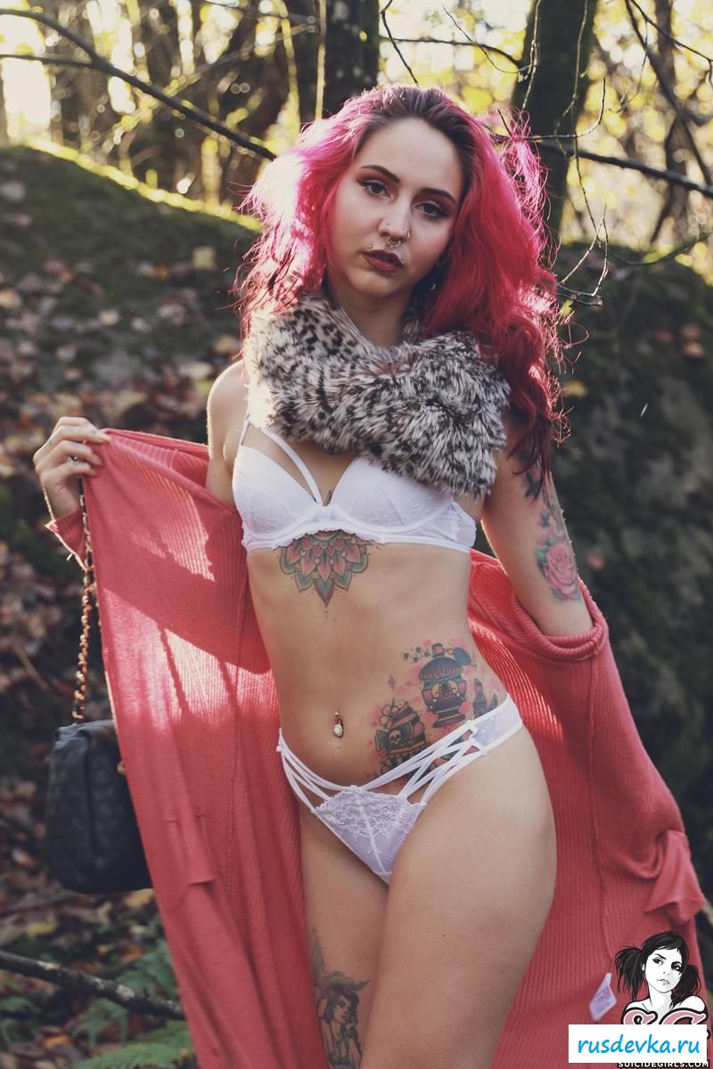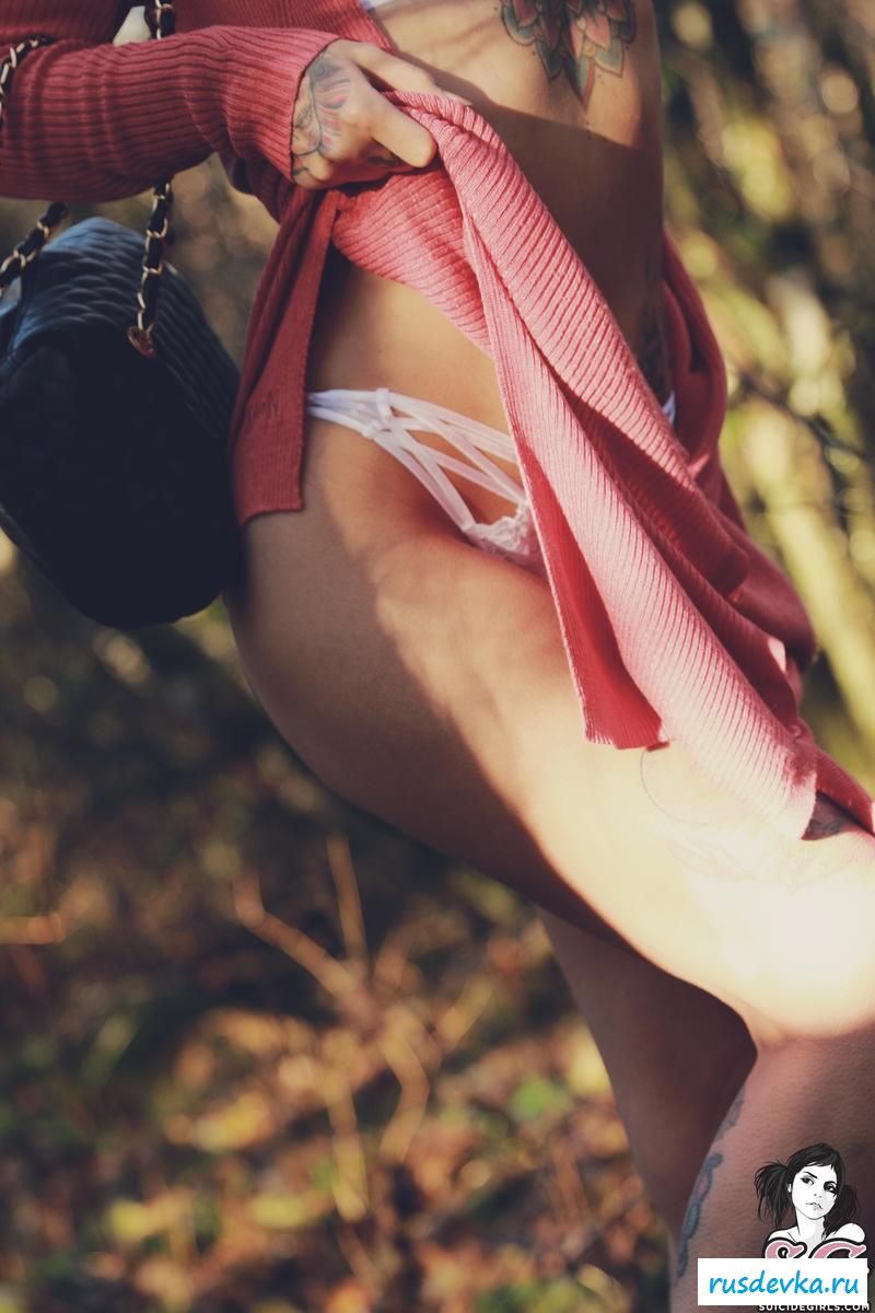 Худенькая сучка по имени Алина выбралась в лес, дабы попозировать наедине. Девушка очень любит быть наедине и, пока ее никто не видит, умело снимает одежду и теплым осенним днем демонстрирует себя. Телочка показала, что владеет прекрасными сисями, а также не постеснялась эротично покрасоваться татуировками на теле и ненаглядной гладенькой писулькой.
