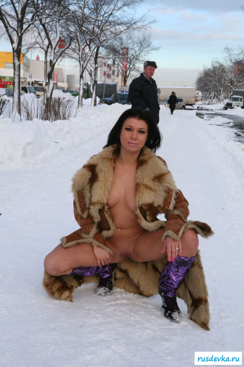 Обнаженная эксгибиционистка гуляет по зимнему городу