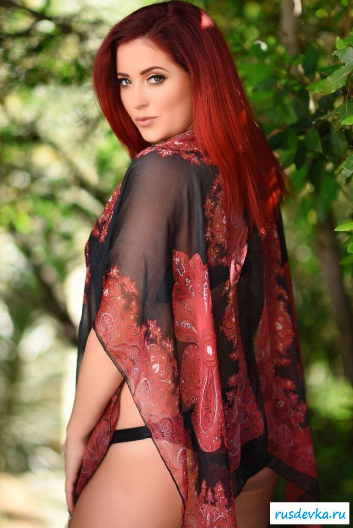 Прогулки среди деревьев совершаемые прекрасной телкой каждый день вошли в привычку, и чтобы разнообразить каждодневные гуляния на своем участке, милая толстушка решила скинуть лёгкий просвечивающийся халат и показать себя обнажённой. Да эта рыжая бестия, даже после такого мимолетного показа своих прелестей надолго запомнится в голове любого зрителя. Крупные сиськи и приличная задница, готовы подарить не один час радости в жизни любого мужика с фантазией.